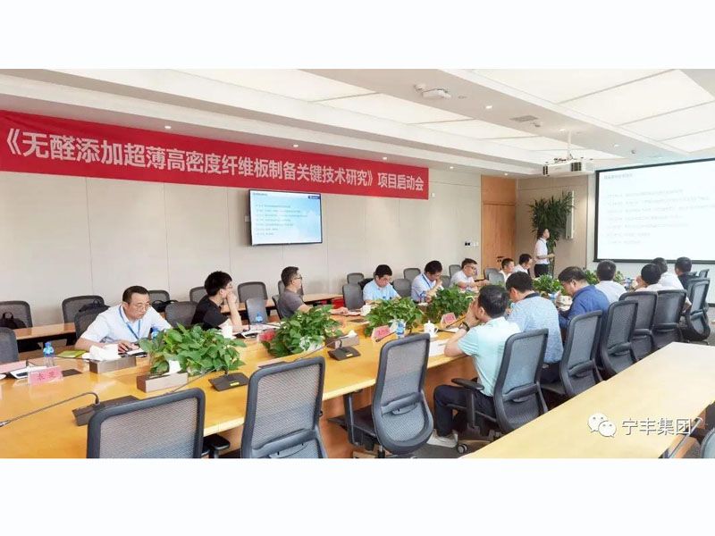 7月8日,寧豐集團、萬華化學(xué)、中國林科院木材所合作項目“無醛添加超薄高密度纖維板制備關(guān)鍵技術(shù)研究”啟動會在萬華化學(xué)總部舉行。中國林業(yè)科學(xué)研究院副院長儲富祥、中國林科院木材工業(yè)研究所所長傅峰、中國林科院木材工業(yè)研究所副所長呂斌等多位專家出席本次項目啟動會。寧豐集團作為重點承擔(dān)單位受邀出席,研究院院長吳方境匯報了現(xiàn)階段零醛板實際生產(chǎn)中存在的問題及下一步重點攻關(guān)的工藝點等內(nèi)容。